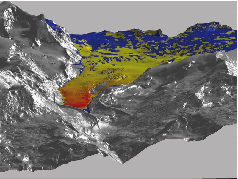 Findelgletscher als beleuchtetes Gelände, überlagert mit den Dickenänderungen des Findelgletschers bis 2009. Die Eisverluste sind in den Farben Grün bis Rot gezeigt, der Dickenzuwachs in Blau.