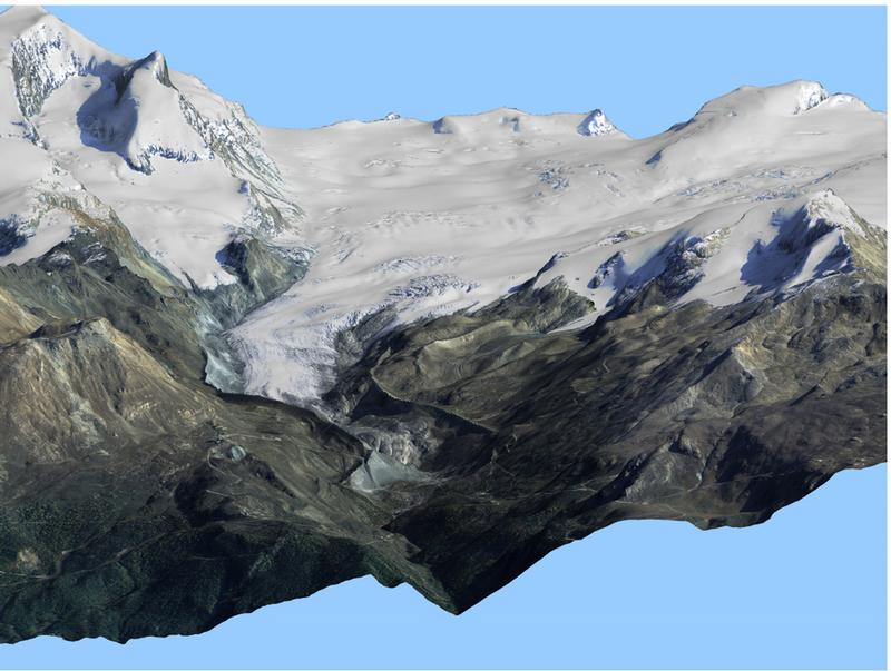 Virtuelle, dreidimensionale Ansicht des Findelgletschers bei Zermatt basierend auf den Laserdaten von 2005, überlagert mit einem Luftbild aus 2006 swisstopo (reproduziert mit Bewilligung von swisstopo BA091673)