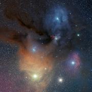 Farbaufnahme des Sternentstehungsgebiets um den Stern Rho Ophiuchi, etwa 400 Lichtjahre von der Erde entfernt. Mit dem APEX-Teleskop in Chile haben Forscher in dieser Region zum ersten Mal das Molekül Wasserstoffperoxid im Kosmos nachgewiesen. Der Fundort ist durch einen roten Kreis markiert. Rho Ophiuchi ist der helle Stern inmitten der blauen Region im oberen Bildteil. Als hellster Stern im Gesichtsfeld leuchtet der gelblich erscheinende Antares in der unteren Bildhälfte. Rechts davon ist der Kugelsternhaufen Messier 4 sichtbar. ESO / S. Guisard