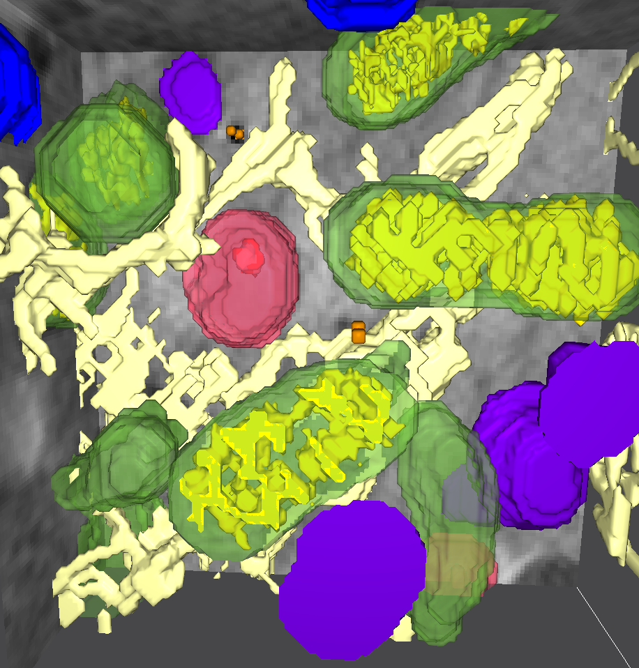 Kombination der einzelnen Aufnahmen zu einem 3D-Bild der Zellarchitektur mit Mitochondrien (grün), Lysosomen (lila), multivesikulären Körperchen (rot) und dem endoplasmatischen Retikulum (beige). Bild: Burcu Kepsutlu/HZB