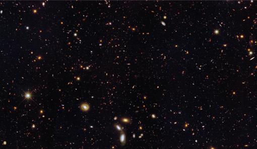 Eine der zwei Himmelsregionen, in denen das CANDELS-Team einen ungewöhnlichen neuen Typ Zwerggalaxie gefunden hat. Der gezeigte Ausschnitt ist Teil des so genannten GOODS-South-Felds im Sternbild Chemischer Ofen (lat. Fornax). Es handelt sich um ein Falschfarbenbild aus Daten der beiden astronomischen Kameras ACS und WFC3 des Weltraumteleskops Hubble. Quelle: Bild: NASA/ESA, A. van der Wel (MPIA), H. Ferguson & A. Koekemoer (STScI) und das CANDELS-Team. (idw)