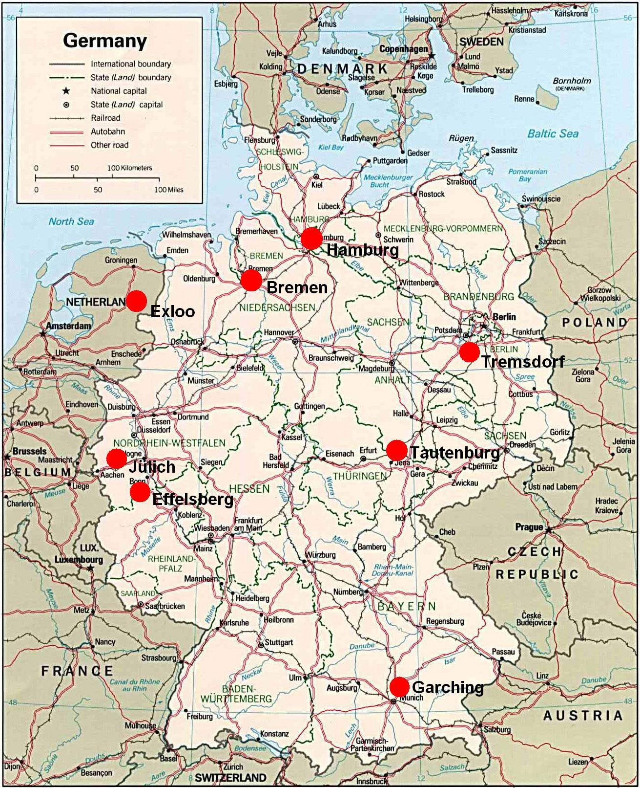 Standorte der ersten 7 geplanten LOFAR-Stationen in Deutschland sowie des LOFAR-Kerns aus 23 Stationen bei Exloo in Westfriesland/Niederlande. ©(Grafik: D. Lehmann, Astrophysikalisches Institut Potsdam)