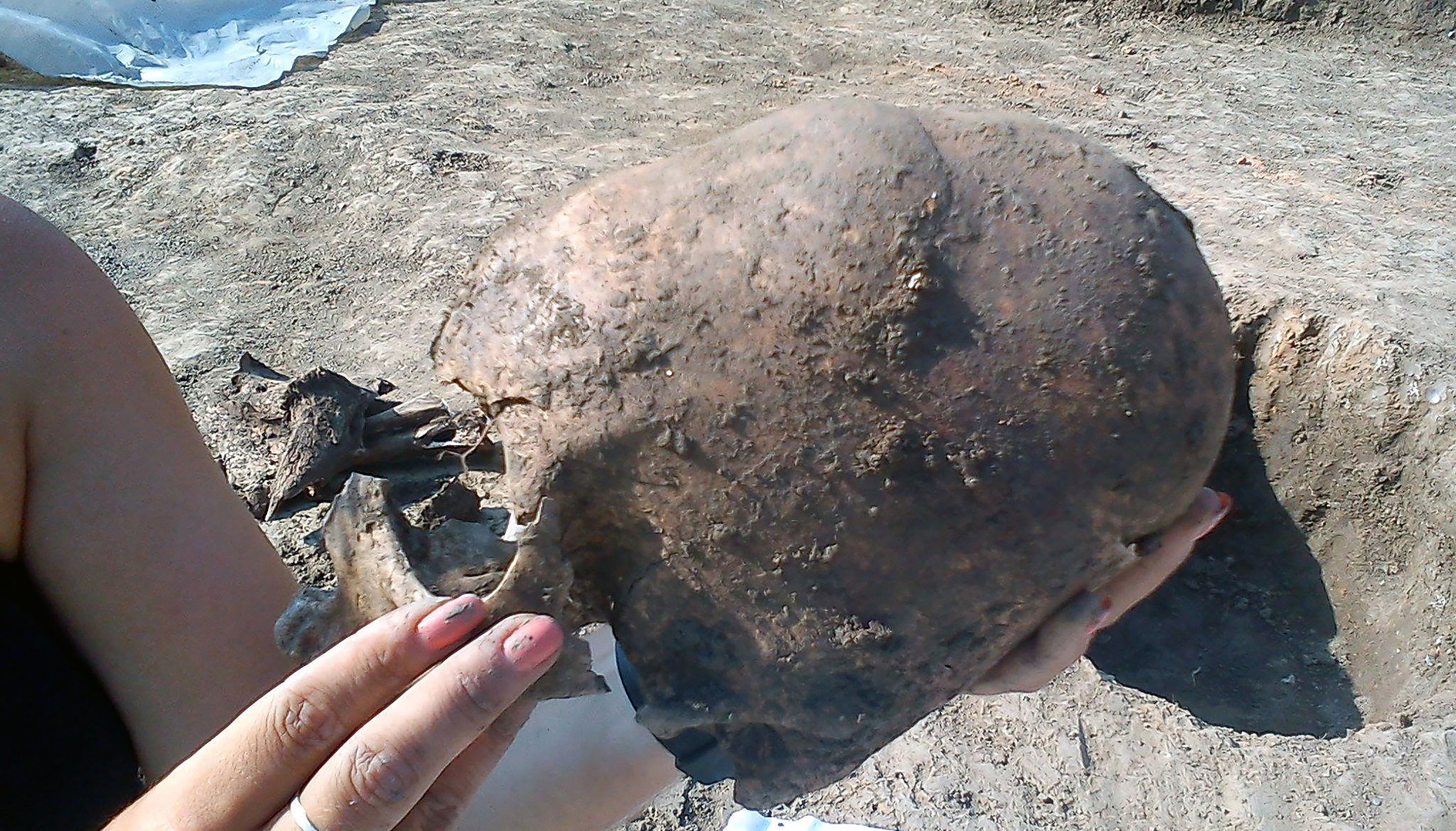 Der langgezogene Schädel bei der Ausgrabung.