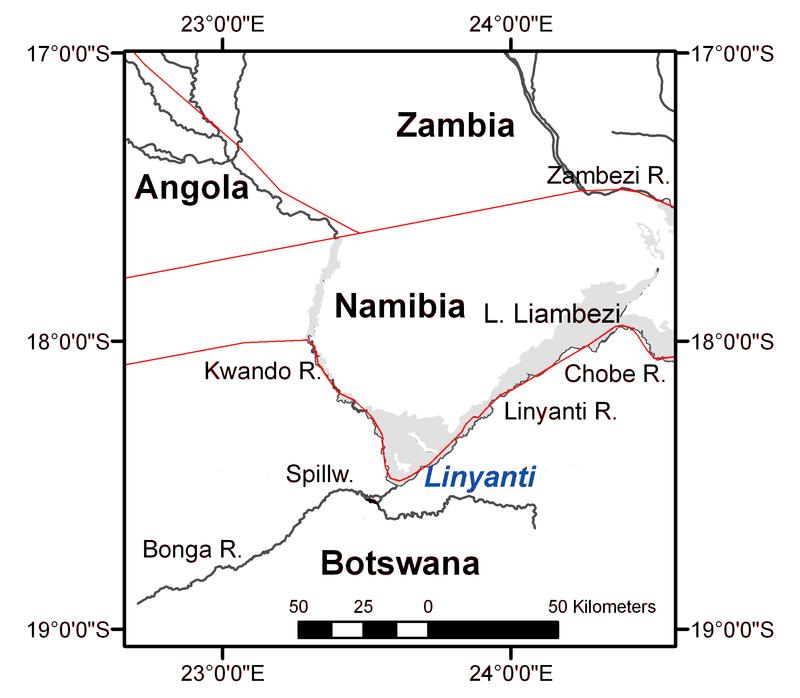 Das dreieckige Linyanti-Feuchtgebiet liegt in Namibia an der Grenze zu Botswana. Die Ländergrenzen sind rot dargestellt. Quelle: Bild: Tobias Landmann (idw)