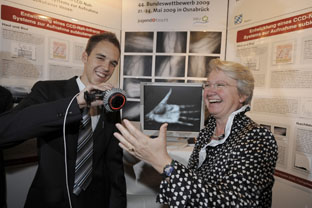 Prof. Dr. Annette Schavan, Bundesministerin für Bildung und Forschung, gratuliert Bundessieger Steffen Strobel (20) aus Seeshaupt in Bayern, der mit dem Preis der Bundeskanzlerin für die originellste Arbeit ausgezeichnet wurde. Bild: obs/Stiftung Jugend forscht e.V./Deutsche Bundesstiftung Umwelt (DBU)