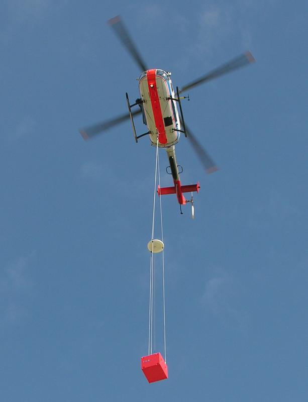 Unter dem Hubschrauber des DLR befindet sich eine Referenzantenne (Mitte) und eine Empfangseinrichtu Quelle: (Foto: FCS Flight Calibration Services GmbH) (idw)