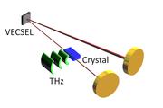Schema der neuartigen THz-Quelle: Der nichtlineare Kristall befindet sich innerhalb der Laserkavität, die durch zwei Spiegel und einen VECSEL-Chip gebildet wird. Über einen Frequenz-Mischungsprozess werden aus den zwei Laserfarben THz-Wellen (grün) erzeugt und abgestrahlt. (Grafik: AG Koch)