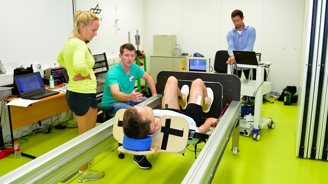 Ein Sprungschlitten macht ein Sprungtraining in horizontaler Lage sowie in Schwerelosigkeit möglich. Rechts im Hintergrund: Dr. Andreas Kramer, der das Trainingskonzept gemeinsam mit Prof. Dr. Markus Gruber an der Universität Konstanz entwickelt hat.