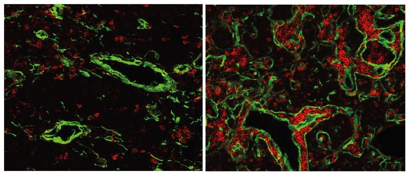 Der normale Thymus einer Maus (links) enthält nur wenige B-Zellen (rot). Wenn das Gen FOXN4 aktivier Quelle: MPI für Immunbiologie und Epigenetik (idw)