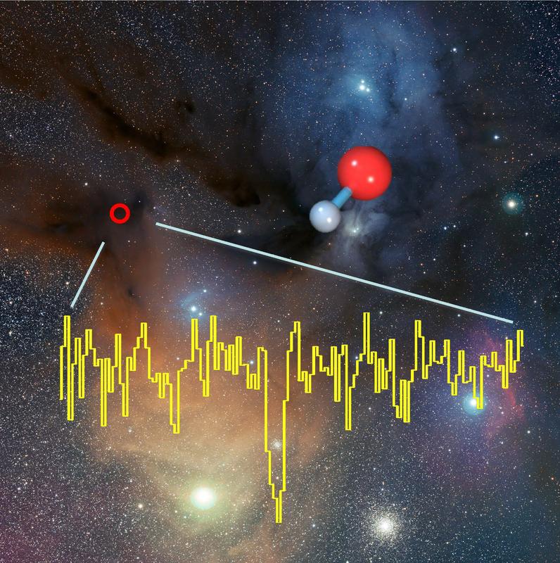 Die Aufnahme zeigt das farbenprächtige Sternentstehungsgebiet um den Stern Rho Ophiuchi in ca. 400 Lichtjahren Entfernung. Die Position des massearmen Protosterns IRAS16293-2422 ist mit einem roten Kreis markiert; in dieser Richtung konnte das Molekül OD, also deuteriertes Hydroxyl, erstmalig im Weltraum nachgewiesen werden. Das mit dem GREAT-Empfänger an Bord von SOFIA beobachtete Spektrum zeigt die Moleküllinie bei einer Frequenz von 1,3915 Terahertz (oder 0,215 mm Wellenlänge). Das OD-Molekül (rot: Sauerstoff, grau: Deuterium) ist eine Isotopenvariante von Hydroxyl (OH), bei der das Wasserstoffatom durch sein schwereres Isotop Deuterium ersetzt wurde. OD markiert einen wichtigen Zwischenschritt auf Weg zur Bildung von Wasser im Universum, und mag als chemische Zeitmarke in den Frühphasen der Sternentstehung dienen. Der helle gelblich leuchtende Stern unten links ist Antares im Sternbild Skorpion, einer der hellsten Sterne überhaupt am Himmel. Rechts von Antares ist der Kugelsternhau Quelle: Bildrechte: Spektrum: MPIfR/B. Parise, Hintergrund-Foto: ESO/S. Guisard (www.eso.org/~sguisard). (idw)