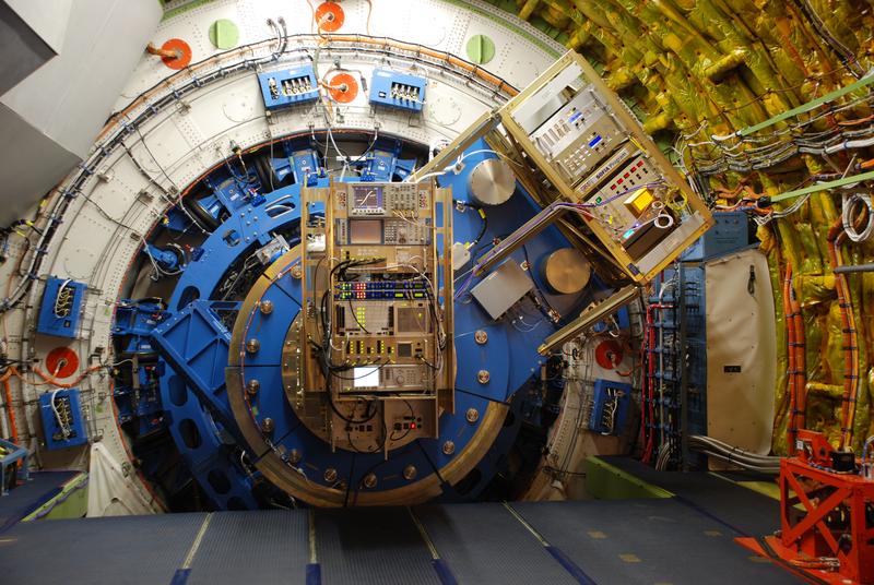 Das Ferninfrarot-Spektrometer GREAT (auf dem Bild in senkrechter Position) ist innerhalb der Druckkabine an den Teleskopflansch am Gegengewicht des Teleskops angeschlossen. Während des Fluges bewegt sich GREAT in einem Winkelbereich von ±20 Grad von der Senkrechten. Das Teleskop (auf dem Bild ist das Gegengewicht in 45-Grad-Stellung in Blau sichtbar) kann dem astronomischen Objekt in einem Winkelbereich zwischen 25 und 65 Grad von der Senkrechten folgen. Quelle: Foto: R. Güsten/MPIfR. (idw)