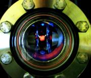 Gefangene Rubidium-Atome (leuchtend rot in der Bildmitte) werden durch einen blauen Laserstrahl in den Rydberg-Zustand angeregt. Bild: Universität Stuttgart