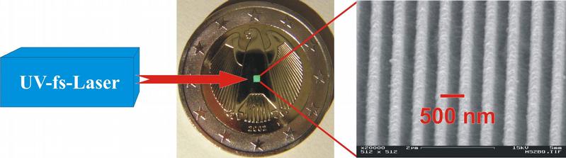 Die lasergeschriebene periodische Oberflächenstruktur - hier auf einer Euromünze - führt zu charakteristischen Farbreflexen. Quelle: Laser Laboratorium Göttingen e.V.