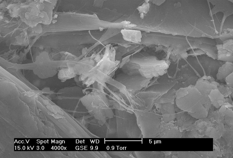 Stabiles Papier dank Ton: Fasern und mineralische Füller (helle Plättchen in der Bildmitte) unter dem Elektronenmikroskop (Aufnahme: Frank Friedrich, KIT) Quelle: (idw)