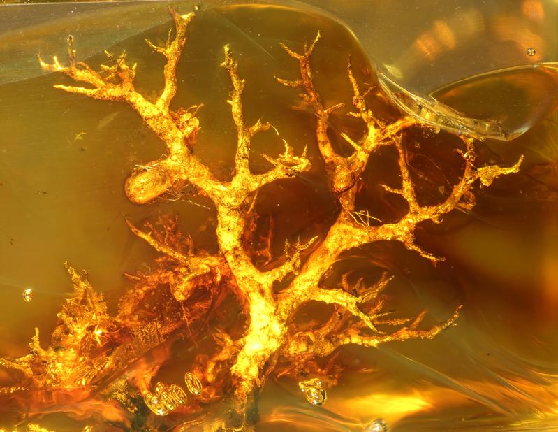 Strauchflechte aus Baltischem Bernstein. Quelle: Foto: Alexander Schmidt, Universität Göttingen, und Nature Plants (idw)