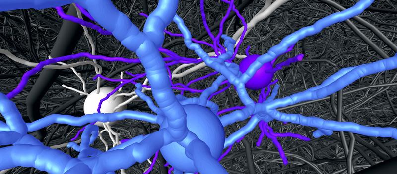 Nervenzell-„Trio“ (in Farbe), das im dichten Netzwerk des Gehirns auf besondere Weise miteinander verbunden ist (in grau). Bild: Max-Planck-Institut für Hirnforschung (idw)