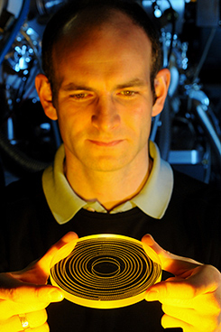 Attosekunden-Lichtblitze können unter Einfluss von sehr starken Laserpulsen auch an Spiegeloberflächen entstehen. Jeder auf den Spiegel auftreffende Laserpuls hinterlässt einen punktförmigen Abdruck auf dem Spiegel und erzeugt dabei Attosekunden-Lichtblitze. Quelle: Foto: Thorsten Naeser (idw)