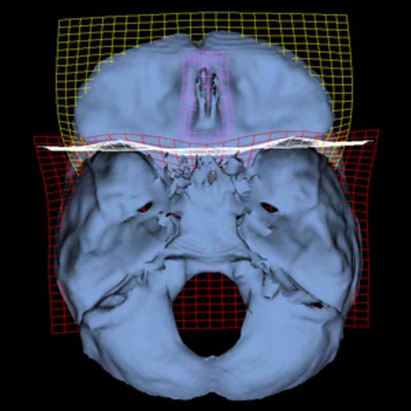 3D-Rekonstruktion der Schädelbasis. Die Gitter zeigen Veränderungen vom frühen Menschen zum Homo sapiens auf. Bild: 3D Morphometrics Lab, Paleoanthropology Group, Museo Nacional de Ciencias Naturales, CSIC (idw)