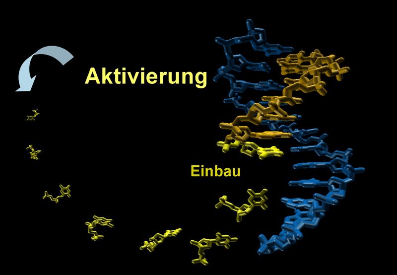 Die Abbildung zeigt eine DNA-Doppelhelix, die durch den Einbau von zuvor chemisch aktivierten Desoxynukleotiden wächst. Bild: Institut für Organische Chemie, Uni Stuttgart