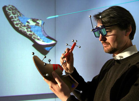 Schuhe in der 3D-Welt: Prof. Dr. Guido Brunnett hält eine Schuhattrappe in der Hand, deren Sensoren Bewegungen auf das virtuelle Schuhmodell übertragen. Farben, Materialien, Absätze oder Schmuckelemente können mit einem Auswahlstift festgelegt werden. Foto: TU Chemnitz