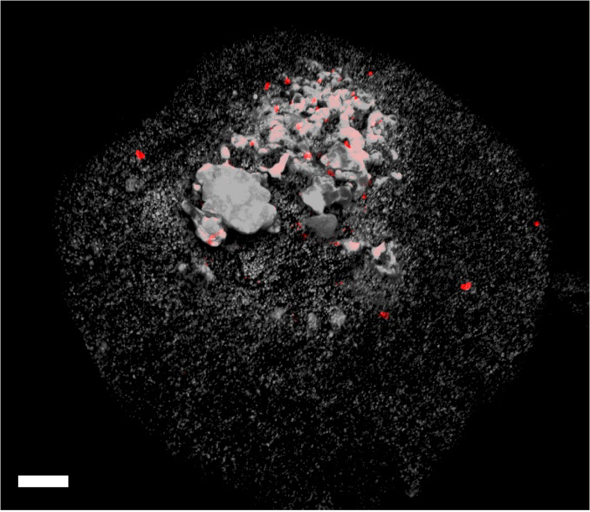 Epifluoreszenzmikroskopisches Bild von Methanoliparia-Zellen, die an einem Öltröpfchen haften. Die weiße Maßstabsleiste hatte eine Länge von 10 Mikrometern.