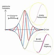 Ultrakurzer Lichtimpuls mit stabilisierter optischer Phase. Ein ultrakurzer Lichtimpuls besteht aus wenigen Schwingungen des Lichtfeldes (rote oder blaue Linie). Schwarze Linien: Feldeinhüllende des Impulses. Die maximale Feldstärke des Impulses wird erreicht wenn das Maximum des Feldes mit dem Impulszentrum zusammenfällt (rote Linie). Mit dem neu entwickelten Verfahren wird diese Schwingungsform des Feldes stabilisiert. Die gelb bzw. grün umrandeten Vergrößerungen zeigen die geringsten zeitlichen Schwankungen der Wellenform, die bisher erreicht wurden (ca. 100 Attosekunden, Laser-Regelung) und die mit dem neuen Verfahren der direkten Feldsynthese erreicht wurden (12 Attosekunden). Abb.: MBI