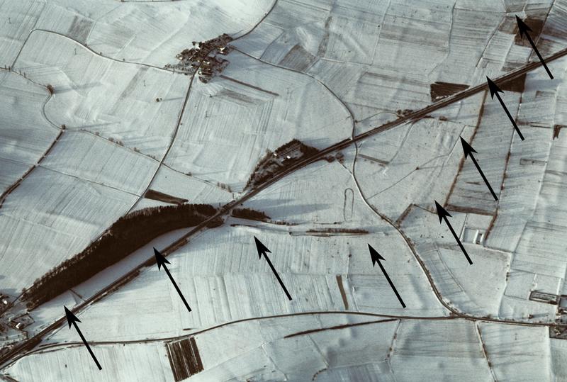 Luftbildaufnahme des Karlsgrabens im Winter. Die Pfeile zeigen den s-förmigen Verlauf des Karlsgrabens Quelle: O. Braasch, Bayerisches Landesamt für Denkmalpflege. Luftbildarchiv, Archivnummer 7130_027, Filmnummer 3840B, Bild 12, Aufnahme 19_02_1985 (idw)