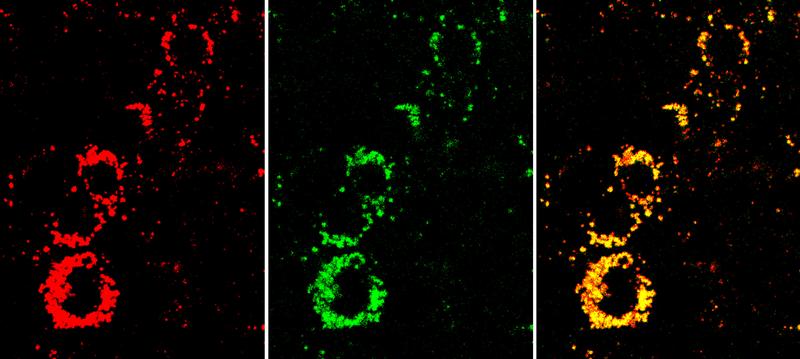 Nanosensoren zeigen durch das gelbe Signal im Überlagerungsbild (rechts), dass die Zellen aktiv sind. Wären sie in einem schlechten Zustand , wären sie deutlich röter. Mitte: Signal des Indikatorfarbstoffs. Links: Signal des Referenzfarbstoffs. Bild: Fraunhofer EMFT (idw)