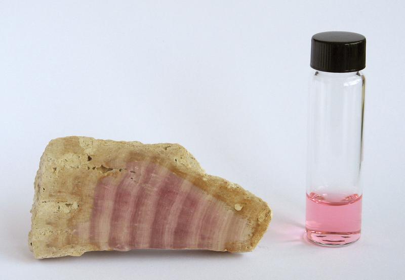 Fossile Kalkrotalge (Längsschnitt) aus dem Jura mit ungewöhnlicher rosaroter Färbung und isolierter antibiotika-ähnlicher Farbstoff. Quelle: Foto: JACS und Klaus Wolkenstein, Universität Göttingen (idw)