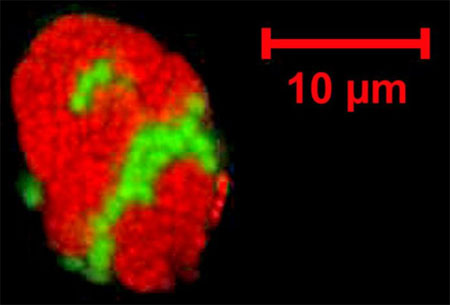 Abb. 2: Das neue Konsortium bestehend aus Archaea (grün) und Bakterien (rot). Die Organismen wurden mit einer speziellen Färbetechnik (FISH) sichtbar gemacht. Bild: T. Lösekann, Max-Planck-Institut für marine Mikrobiologie