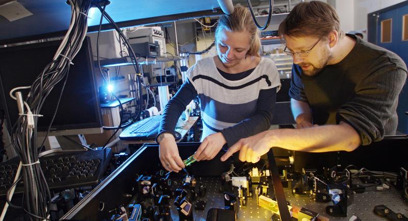Julia Zeuner und Prof. Dr. Alexander Szameit von der Uni Jena bei der Arbeit an einem Hochleistungs-Kurzpulslaser, mit dessen Hilfe die optischen Strukturen im Glas-Chip hergestellt wurden. Quelle: Foto: Jan-Peter Kasper/FSU (idw)