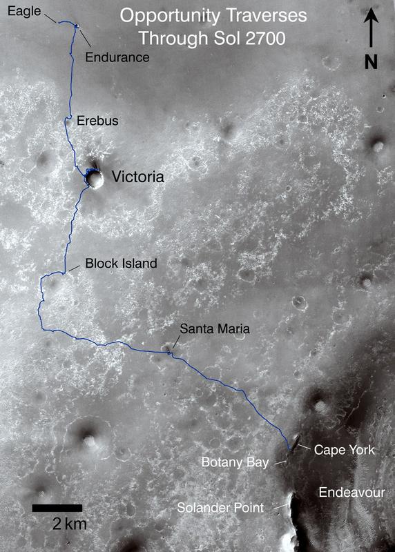 Opportunity legte von der Landestelle im Eagle-Krater bis zum Rand von Endeavour mehr als 33 km zurück (blaue Linie). Ein Ausschnitt Endeavours ist rechts unten am Bildrand zu sehen. Die Ge-steine des Kraterrandes sind im Cape York freigelegt. Das Bild ist ein Mosaik von Bildern aufge-nommen mit der 'Context Camera' an Bord von NASAs Mars Reconnaissance Orbiter Quelle: Bildquelle: NASA/JPL-Caltech/MSSS (idw)