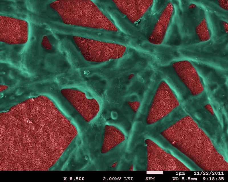 Film aus Hämatit-Nanopartikeln (rot) mit vernetztem Phycocyaninprotein (grün) . Quelle: Bild: Dr. E. Vitol, Argonne National Laboratory (idw)