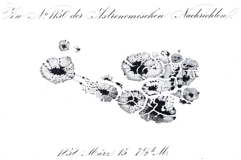 Hochgenaue Bleistiftzeichnung einer Gruppe von Sonnenflecken von Samuel Heinrich Schwabe aus dem Jahr 1858. Veröffentlicht in: Astronomische Nachrichten/AIP