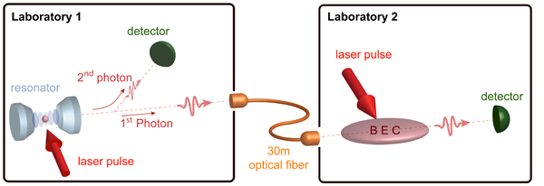 Bild: Ein einzelnes Atom und ein BEC in getrennten Laboren dienen als Knoten in einem einfachen Quantennetzwerk. Um Verschränkung zwischen beiden Systemen zu erhalten, wird das Atom mit Hilfe eines Laserpulses zum Aussenden eines Photons angeregt, das mit dem Atom verschränkt ist. Das Photon dient als Übermittler der Verschränkung. Über ein Glasfaserkabel wird es in das Nachbarlabor überführt und im BEC gespeichert. Nun sind Atom und BEC verschränkt. Nach einer gewissen Zeit wird das gespeicherte Photon wieder ausgelesen und der Zustand des Atoms auf ein zweites Photon übertragen. Verschränkung zwischen diesen Photonen weist nach, dass alle Schritte des Experiments erfolgreich durchgeführt wurden. Rempe