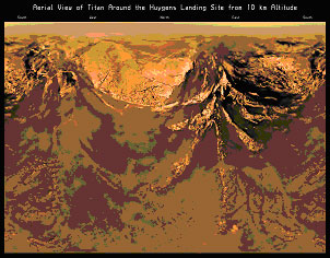 "Vogelperspektive" der Huygens-Landestelle auf Titan in 10 km Höhe. Kaum sichtbare Schleierwolken schweben in diesen Höhen, aus denen leichter Methan-Nieselregen fällt. Bild: ESA/NASA/JPL/University of Arizona