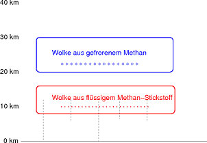 Schematische Skizze der Schleierwolken auf Titan. Die obere und untere Wolke unterscheiden sich in der Zusammensetzung und im Aggregatzustand.