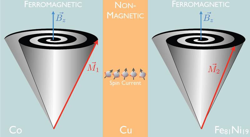Zwei ferromagnetische Schichten (Co und Fe81Ni19) sind durch eine dickere nicht-magnetische Cu-Schicht getrennt. Wenn die magnetischen Momente M1 in der linken Schicht zur Präzession um eine magnetische Feldachse Bz angeregt werden, dann wird auch die Präzession der magnetischen Momente M2 in der zweiten Schicht davon beeinflusst. Diese gegenseitige Beeinflussung wird Spin-Pump-Effekt genannt und bewirkt, dass die Präzession von M1 stärker gedämpft wird, wenn die Momente M1 und M2 antiparallel ausgerichtet sind als im parallelen Fall. Der Spinstrom, der durch die nicht-magnetische Cu-Schicht „gepumpt“ wird, ist schematisch durch kleine Pfeile angedeutet