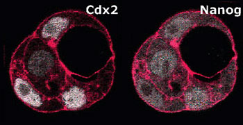 Aus dem 8-Zell-Stadium isolierte Zellen teilen sich und organisieren sich selbst zu "Mini-Blastozysten": Zellen mit viel Cdx2 (weiß, links) orientieren sich eher außen. Das Protein Nanog (weiß, rechts) beeinflusst die Position der Zellen nicht. Die Ränder der einzelnen Zellen sind rot angefärbt. Bild: MPI für molekulare Biomedizin