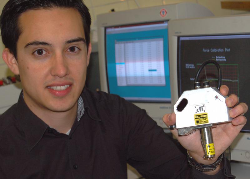 Wolfgang-Moritz Heupel, wissenschaftlicher Mitarbeiter an der Universität Würzburg, zeigt den Scan-Kopf eines Rasterkraftmikroskops. Unter anderem mit diesem Gerät ist der Nachweis gelungen, dass speziell konstruierte Peptid-Moleküle die gewünschte Wirkung zeigen: Sie kleben VE-Cadherin-Moleküle aneinander. Foto: Robert Emmerich