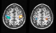 Aktivität in der motorischen Hirnrinde bei einer tatsächlich ausgeführten Bewegung der Hände im Wachen (linkes Bild) und während einer geträumten Bewegung (rechtes Bild). Blaue Regionen spiegeln die Aktivität bei einer Bewegung der rechten Hand wider, die in der linken Gehirnhälfte deutlich wird, wohingegen rote Regionen die entsprechende Bewegung der linken Hand auf der gegenüberliegenden Hirnhälfte anzeigt. MPI für Psychiatrie