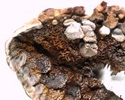Unförmig gewachsener krustiger Fruchtkörper des Hausschwamms mit einem Durchmesser von rund zehn Zentimetern, gefunden auf einer Badezimmerwand in einem befallenen Göttinger Altbau. Universität Göttingen