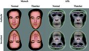 Die Thatcher-Illusion: Es ist schwieriger lokale Veränderungen in einem Gesicht wahrzunehmen wenn dieses auf dem Kopf steht. Hier werden zwei Gesichter eines Individuums gezeigt. Ein Bild ist normal, das andere ist ein deutlich grotesker Anblick bei aufrechter Präsentation, nicht aber, wenn die Gesichter invertiert gezeigt werden. Diese Illusion verschwindet zudem, wenn Gesichter einer anderen Spezies auf die gleiche Weise manipuliert werden (siehe Affengesichter). Graphil: Christoph Dahl / Max-Planck-Institut für Entwicklungsbiologie