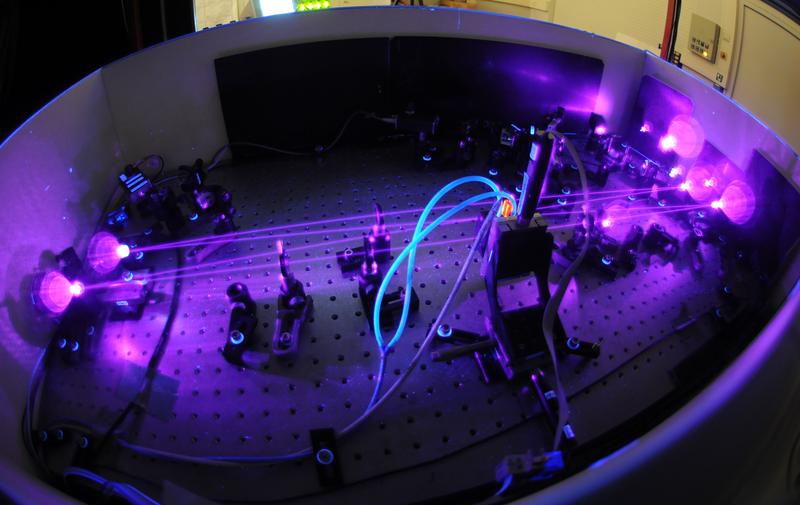 Innerhalb der vier Resonatorspiegel überhöhen sich die ultravioletten Lichtpulse fortlaufend. Die verschränkten Photonen werden von einem Kristall, der sich im schwarzen Gehäuse befindet (mit blauen Schläuchen verbunden), erzeugt. Bild: Thorsten Naeser