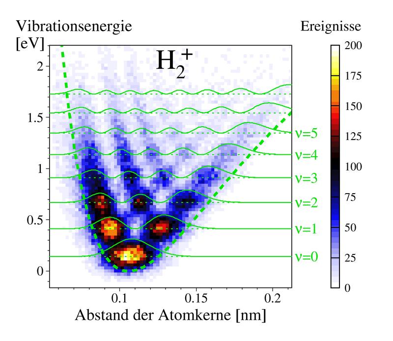 Bevorzugte Aufenthaltsorte von Protonen im einfach ionisierten Wasserstoffmolekül (gelb markiert die höchste Wahrscheinlichkeit). Die Messpunkte liegen genau in den Bergen der theoretisch berechneten Wellenfunktion (grün). Je höher die Energie der Anregungszustände ist, desto mehr bevorzugte Orte gibt es. Genau dazwischen sind die Protonen allerdings nie anzutreffen. Quelle: Bild: Lothar Schmidt (idw)