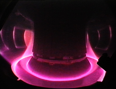 Blick in das viele Millionen Grad heiße Plasma der Fusionsanlage ASDEX Upgrade in Garching. Der Plasmarand wird auf die speziell ausgerüsteten Divertor-Platten am Boden gelenkt. Quelle: Foto: IPP (idw)