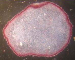 Trichoplax adhaerens mit angefärbten Randbereichen, Aufnahme im Binokular. Bernd Schierwater
