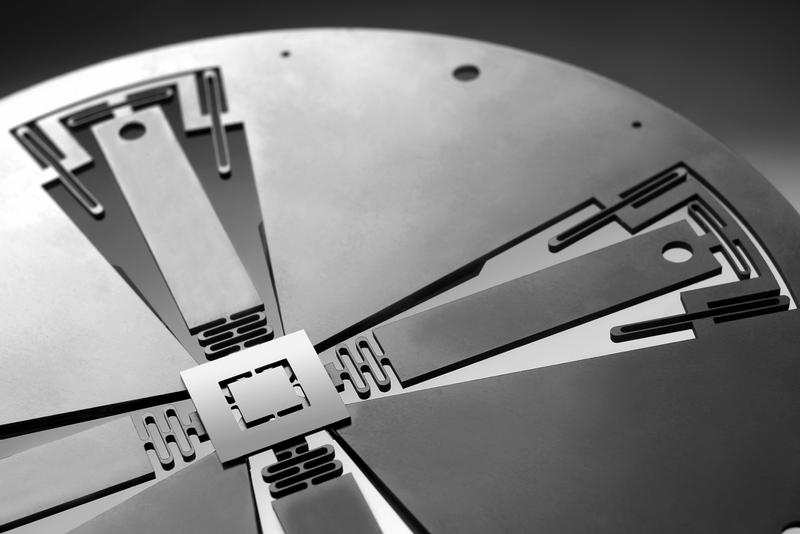 Ein Kraftsensor (Quadrat Mitte) sorgt dafür, dass Roboter Kollisionen unverzüglich wahrnehmen. Der Sensor ist auf einer Stahlplatte befestigt und kann so an das äußere Gelenk des Roboterarms geschraubt werden. Ein Kraftsensor (Quadrat Mitte) sorgt dafür, dass Roboter Kollisionen unverzüglich wahrnehmen. Der Sensor ist auf einer Stahlplatte befestigt und kann so an das äußere Gelenk des Roboterarms geschraubt werden. Bild: Fraunhofer ISIT