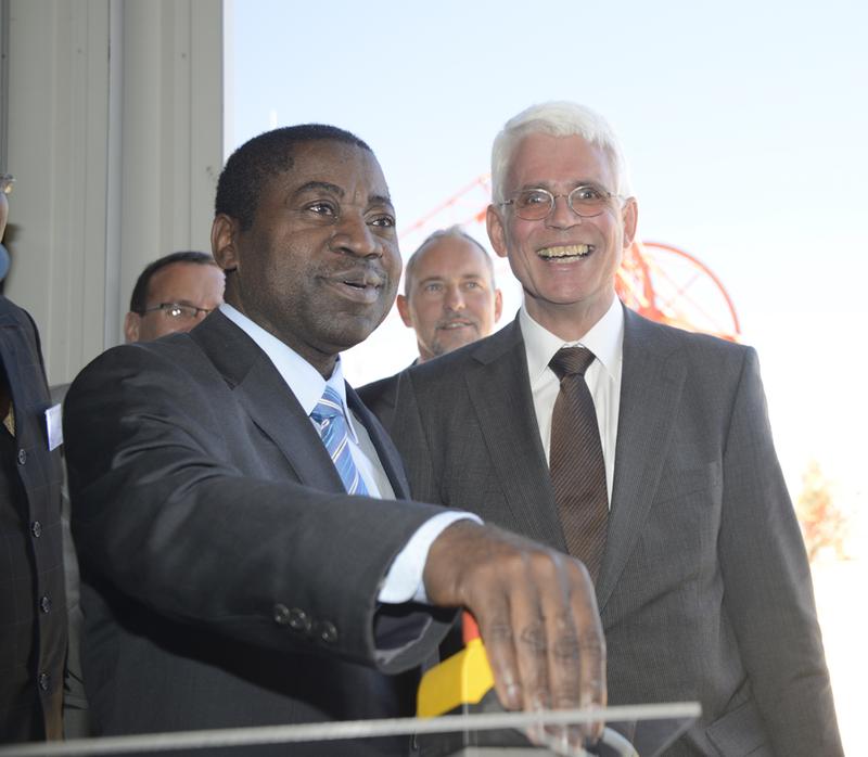 Bildungsminister Abraham Iyambo setzt per Knopfdruck H.E.S.S. II in Bewegung; rechts Werner Hofmann. Quelle: C. Föhr, H.E.S.S.-Kollaboration (idw)
