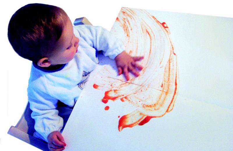 Das kindliche Schmieren steht am Beginn der sensomotorischen Ausdrucksbewegung, das fällt meist in den letzten Monaten des ersten Lebensjahres zusammen, wenn die Kinder beginnen, Brei zu essen. Auf diesem Bild verschmiert Lara, neun Monate alt, Karottenbrei auf dem Tisch und beobachtet sehr aufmerksam die Bewegungsspuren, die sie hierbei hinterlässt. Foto: Peez